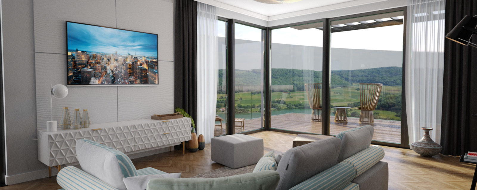 Interior visualizations created for the MODULOR Architectural Studio. A modern interior with a beautiful view.